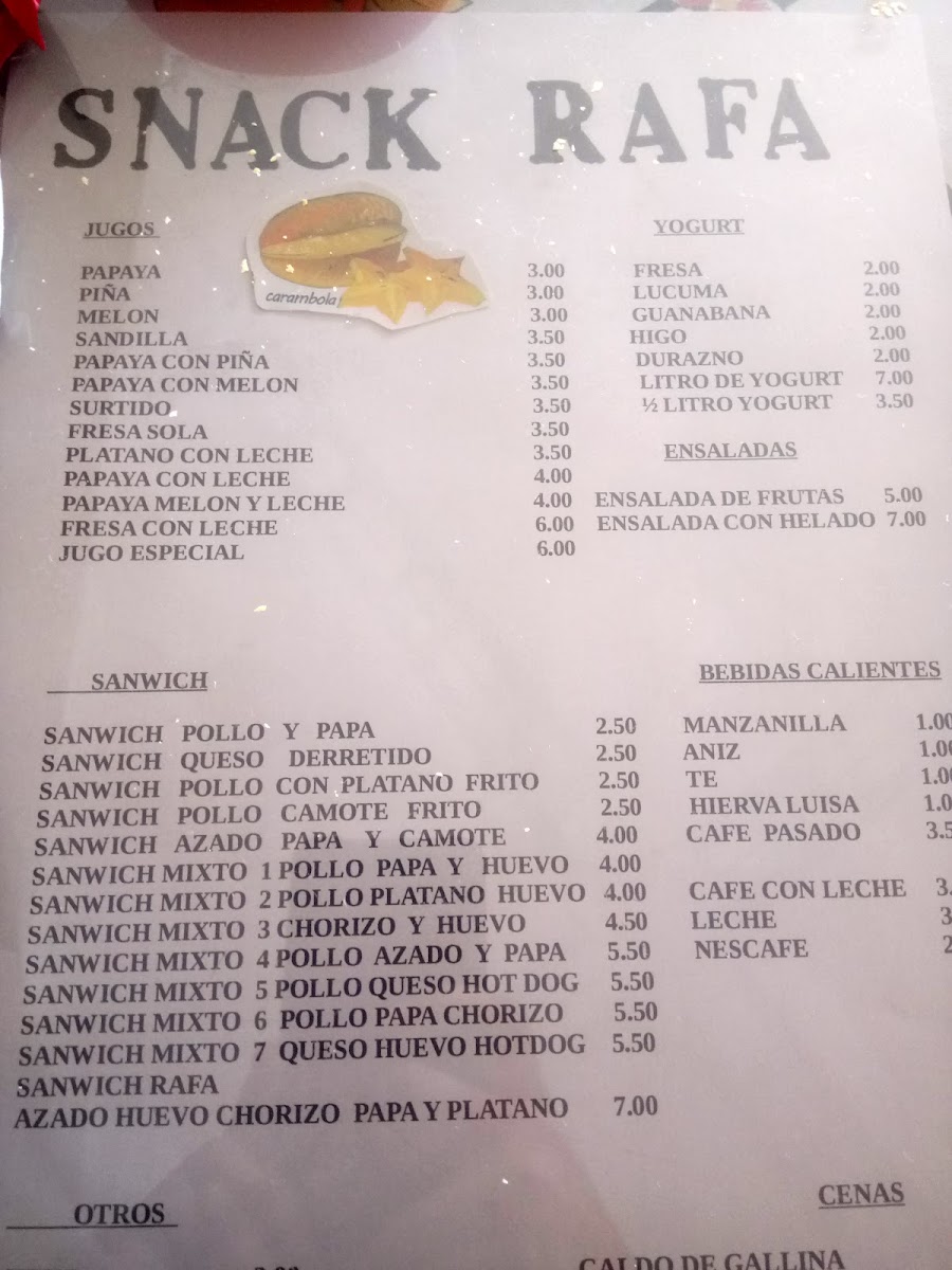 At Snack Rafa, the menu has recently expanded, offering a diverse range of options that are sure to please any palate. Indulge in their delectable grilled dishes, where succulent meat sizzles to perfection, teasing your senses with aromatic spices and mouthwatering flavors. Pair your meal with one of their refreshing juices, crafted from fresh local fruits that burst with vibrant color and flavor. Each sip will transport you to the sun-kissed orchards of Peru, making it the perfect accompaniment to your culinary adventure.